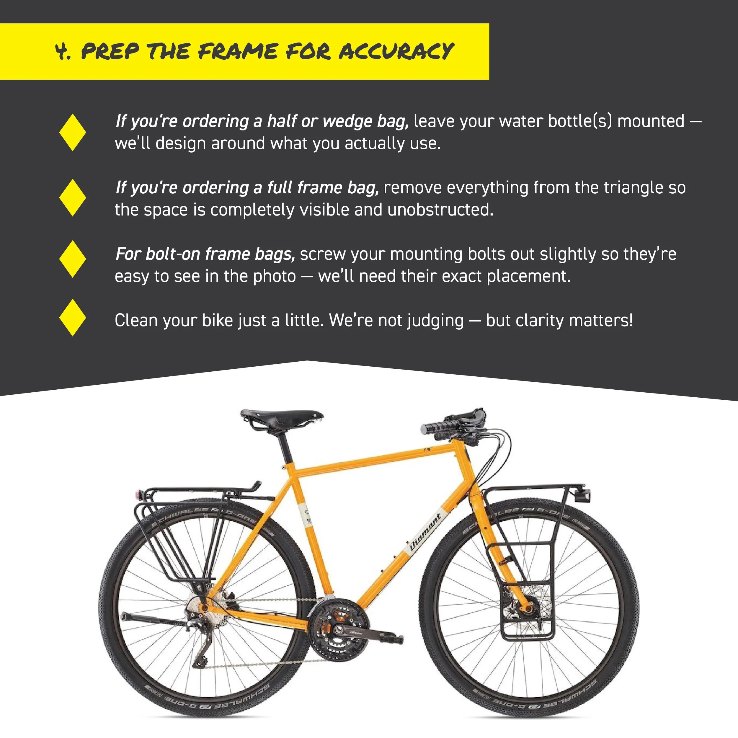 I created a how-to photograph your bike template for new customers, in hopes of making the process of ordering custom frame bags smooth for both customers and the San Util team.